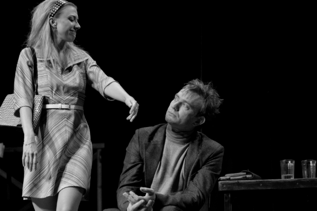 Он же, Шаманов (Александр Кудренко), в свою очередь, предъявил нам образ помятого обстоятельствами мужчины без признаков загадки, но явно страдающего. К чему так много раз в отчаянии закрывать лицо руками? Зачем в финале лежать на верхней ступеньке лестницы, ведущей в комнату Кашкиной, патетически откинув голову с романтически развевающимися волосами? Показалось, что в сцене любовного признания Валентины, когда Шаманов реагирует истерическим бегом по сцене, артисту неловко и совершать эти па, и воспротивиться режиссеру. (Тут вспомнился один уместнейший, знаменитый бег по кругу — бег Юрского в «Фантазиях Фарятьева». Так мы, помнится, ради одной этой раскаленной сцены пересматривали спектакль…)