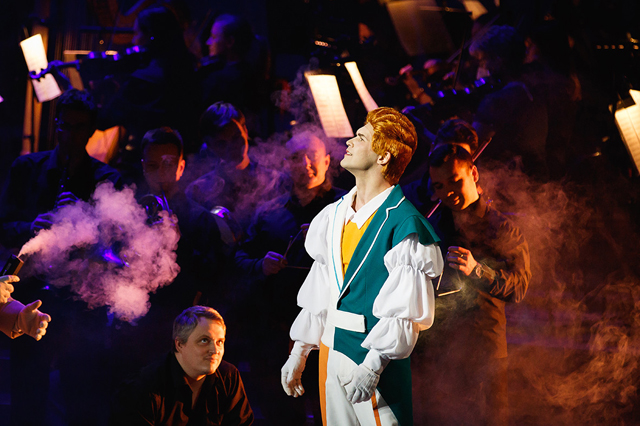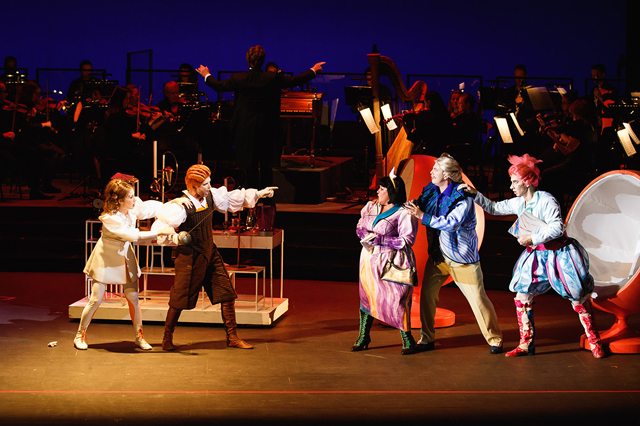 Художественная реальность спектакля — тотально игровая и смеховая. Начиная с «затакта»: к занявшему место за пультом дирижеру подходит человек в одежде и парике ХVIII века. Вряд ли это Россини (все же чисто биографически принадлежащий веку ХIХ), но некий «образ автора», или персонифицированный «дух времени» — века именно XVIII с его рококо и Просвещением. Он с улыбкой и предвкушением Театра на лице вручает дирижеру ноты — и Чудовский начинает знаменитую прелестную увертюру, звучащую под его руководством и вполне серьезно, я бы сказал, профессионально ответственно, и одновременно вполне giocoso. А с поднятым занавесом на сцене начинается многослойная и многозначная жизнь-игра. У Столбовой это даже не игра в квадрате — как у Бомарше и Россини, у которых практически все персонажи кого-нибудь «другого» играют, беспрерывно перевоплощаются, да еще карнавально играют со своими визави-соперниками, — а игра в кубе.