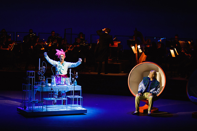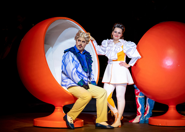 На веселую игровую доминанту «Цирюльника» великолепно работает и, на первый взгляд, простая, с виду минималистская, а на поверку функционально эффективная, ясная и точная сценография Ксении Кочубей. Вся сценография — три высокие стены одной комнаты. Но в каждой — масса разноформатных окошечек, выемочек, дверок. И персонажи постоянно снуют через эти «отверстия» в стенах сюда и обратно. Несколько таких моментальных перемещений — и на сцене другие персонажи и другая воображаемая обстановка. Фантазийность, игровое разнообразие, событийная динамика. Кроме стен на сцене появляется пара разных станков, вокруг которых тоже организуется веселое действие. Один — двухэтажное сооружение с круглыми «пароходными» окнами — нечто вроде большой стиральной машины (какая могла бы быть, если бы это было возможно, в XVIII веке). Сооружение обслуживает такую «реалистическую» деталь обстановки, как постоянная стирка огромного количества белья, чем занимается в доме Бартоло не только прислуга, но и Розина. В «любовно-поэтическом» контексте сюжета стирка и само белье в больших количествах — одно из средств комического остраннения, вторжение прозаической бытовой стихии, столь близкой сердцу просветительских реалистов той эпохи, включая Бомарше. А для Столбовой это средство организации веселого действия: уже в первой своей арии Розина старательно «работает» с длиннющими связками белья, и эта работа, веселя публику, продолжается и в дальнейшем. А когда персонажам приспичивает спрятаться, они с радостью лезут в чрево этого стирального сооружения. Другой станок становится креслом и одновременно чем-то вроде саней для Бартоло во втором акте. В нем он сторожит Розину, слушая уроки прикинувшегося учителем музыки Альмавивы, дремлет, перемещается по сцене, и там же его недолго бреет пудрящий ему мозги Фигаро.