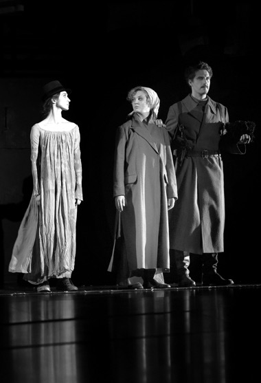 Из драматургии канонического литературного текста Я. Тумина выбирает несколько сквозных мотивов, которые реализуются открыто театральным поэтическим перформативным способом. Есть лирические герои — Серафима и Голубков, сыгранные мягко и психологично, все остальное вокруг — напряженная пугающая фантасмагория, как будто увиденная их глазами. Главная музыкальная тема — печальный полонез Огинского «Прощание с Родиной». Жестокость войны, воспринятая к тому же через полуобморочное от тифозной лихорадки сознание Серафимы, сменяется убожеством и позором нищей эмиграции в чужом гулком черно-сером городе.
