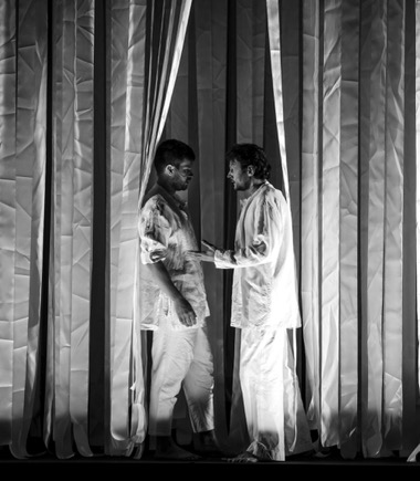 Пора уже, читатель, конкретизировать мои концептуальные конструкции. «Двупланная» сценическая реальность спектакля прямо подсказана пьесой: реальность истории + ее рассказчик. Мильграм и художник пермского «Мороза» Ольга Шаишмелашвили превратили его сценическое пространство в двухэтажное. На верхнем этаже практически нет декораций и реквизита (разве что в самом конце, знаменуя победу супермороза, с колосников спадают белые ленты-«сосульки», плотно заполняя все пространство и фактически изгоняя гибнущих персонажей). Зато над этажом (иногда и между этажами) по светящейся полосе вдруг пробегает график кардиограммы, то своим волнистым контуром репрезентируя живое, работающее сердце, а то вдруг вытягиваясь в ровную унылую линию смерти. И в этом пространстве ведут особое существование и общение два героя трагического сюжета — молодые мужчины в чистейшей белизны исподнем (Александр Гончарук и Александр Аверин). И это только первый симптом радикального переосмысления пьесы Мильграмом. Отношения замерзающих друзей на грани нервного срыва режиссер «оформляет» в череду статичных скульптурных поз и немногих условных движений. Нагнетаемое ситуацией, почти истерическое напряжение эмоций и лихорадочных мыслей внешне тормозится замедленным темпоритмом вышедшей на первый план выразительной пластики (Дамир Сайранов), но парадоксальным образом укрупняет и делает более понятными состояния и смыслы героев, голоса их тела, души и духа. Эффект воздействия обеспечивается соединением этой условной, почти ритуальной формы с филигранной в своем психологизме игрой актеров. Уход от быта делает ощутимой и волнующей трагическую суть происходящего. Что получает мощную поддержку «первого этажа».