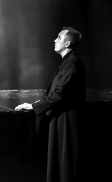 На первом этаже общий колорит темен и отдает чем-то благородно и одновременно сурово торжественным. Это, похоже, фрагмент концертного зала. Рояль, а рядом красавица-арфа. Музыка играет в спектакле одну из главных ролей. Две молодые женщины: арфистка, она же пианистка (Анна Иванчина), и певица (Дарья Копылова). А у рояля — рассказчик (Альберт Макаров). В черном длинном одеянии: то ли сюртуке, то ли пальто, то ли, скорее всего, сутане. Весь спектакль он будет стоять в профиль к залу, только ненадолго, видимо устав, присядет на стул, но тоже в профиль. Макаров-рассказчик ведет свое повествование ровно, отстраненно, поведенчески, интонационно, эмоционально дистанцируясь от своего «предмета»: того, что «происходит» на втором этаже. Голос Макарова, молодого и яркого мужчины, неожиданно звучит немолодо — это голос многоопытного зрелого человека, хорошо понимающего жизнь, много пережившего, отчасти уже усталого. Этот рассказчик, совершенно очевидно, сильно отличается от того героя истории, от имени которого номинально ведется рассказ. Тот слаб, неуверен в себе, не только переживает физическую боль и бытийный ужас, но и откровенно боится смерти.
