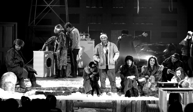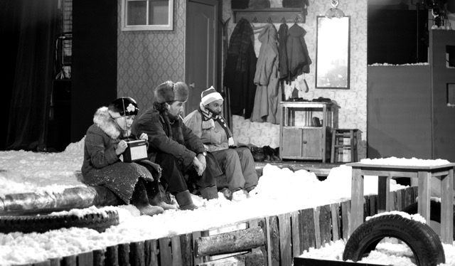 Стол в снегу. За столом перед шахматной доской в эпическом молчании трое пожилых дядек с пивом (бутылки не те! Без плечиков). А так — все до боли помним: петушок, кепка с меховыми отворотами, шапка-ушанка. Василич, Михалыч и Саныч (три отличных работы Дмитрия Плохова, Вячеслава Белякова-Нестерова и Анатолия Бутора) вызывают ностальгию. Периодически по сцене и залу шныряет съемочная группа (Анастасия Козьменко и Андрей Кокшаров), и лица стариков, появляющиеся на экране, просто прекрасны! Так и хочется сказать: таких сейчас нет. Но ведь вот они. Перед нами. А еще за всем зорко наблюдает некто Филомеев (Василий Гусев). Это существо почти инфернальное, то ли genius loci, то ли просто бывший гэбэшник. Он и зал пронзает своим испепеляющим взглядом.