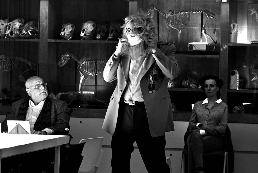 Наконец, третий формат, предлагаемый создателями спектакля, определяется третьим типом перформативного пространства, куда все приглашаются после познавательно-насмешливой экскурсии. На этот раз речь идет о просторном вытянутом прямоугольном помещении, своего рода учебном классе для семинаров и лабораторных занятий. Все здесь подчеркивает лабораторную атмосферу — и ослепительно белые шкафы, сплошным рядом закрывающие нижнюю часть стен, и скелеты животных в витринах над шкафами, и раковины с водопроводом, где в случае чего можно помыть руки. Зрители, числом не более пятидесяти человек, рассаживаются по периметру класса, яркий флуоресцентный свет почти не гаснет: в центре класса представляются основные события «Антигоны», и все у всех на виду. На виду и режиссер со сценографом, сидящие в одном ряду со зрителями, наблюдающие за созданным ими провокативно-лабораторным действием. Их лица ничего не выражают. Но думаю, что это часть провокации.