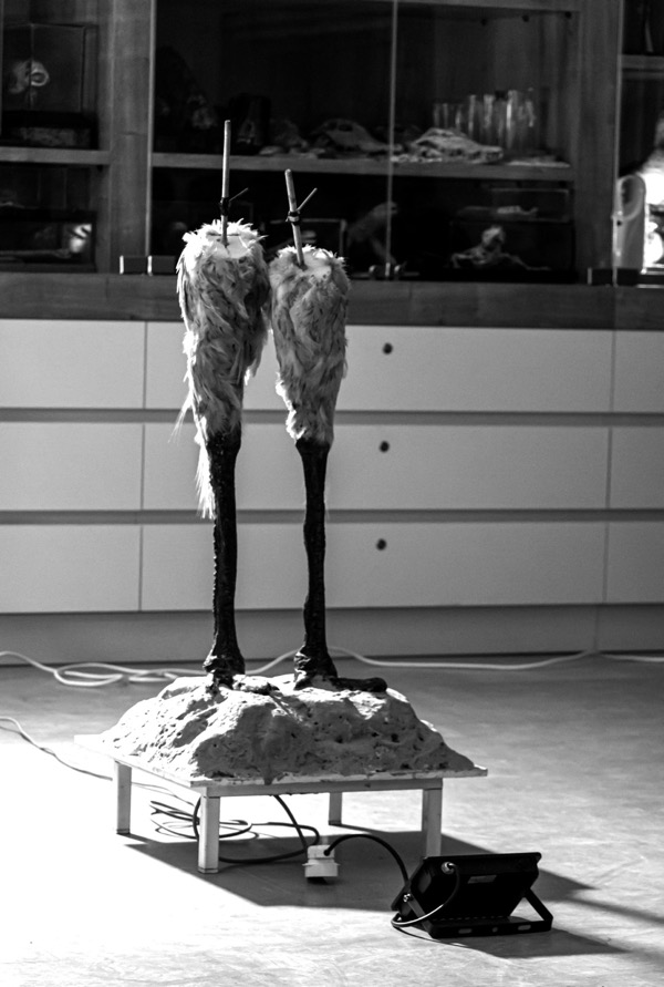 Визуальный минимализм спектакля, разыгрываемого в Музее природы, образует семантические переклички, своего рода серии, придавая почти символическое значение каждому знаку и каждому цвету. Белый отложной воротничок Исмены, подчеркивая ее природную упорядоченность, перекликается с белыми стенными шкафами класса-лаборатории и ослепительно—белым будто бы операционным столом, за которым в кульминационный момент собираются все персонажи спектакля. Этой же серии принадлежит белый столик, у которого большую часть времени проводит старец-критик Хендельзальц. Другая серия создается оттенками желтого цвета. По словам Консон, источником здесь становится птица-майна, та самая, которую Исмена держит в руках в прологе. Майна легко узнаваема по коричневому телу и желтым ногам. Того же желтого цвета и чулки Антигоны, и костюм сторожа/гонца, и современный указательный знак, оповещающий об опасности. Этот желтый то темнеющий, то светлеющий цвет — знак пустыни, песка, земли, что Антигона собирает в свой желтый тубус. К этой серии принадлежит и желтая огромная маска льва, изготовленная по античной традиции как голова с той лишь разницей, что это голова не устрашающего, но игрушечного плюшевого льва. Наконец, белый и желтый входят в прямое соприкосновение в главном знаке спектакля, устанавливаемом в лабораторном классе в начале разворачивающегося там действия. Две огромные ободранные птичьи ноги с широко расставленными когтями и без тела — не только ернически-сюрреальная фиксация, но и предупреждение. Они возвышаются над песочным холмиком, насыпанным на белой крошечной платформе, обозначая memento mori создателей спектакля. Прямого отношения к событиям «Антигоны» эти ноги—калеки не имеют. Их пугающее присутствие создает самостоятельное действие, параллельное всему происходящему. Они подобны знаменитым лошадиным черепам в «Антигоне» Брехта и Каспара Неера, поставленной в 1948 году в Швейцарии.