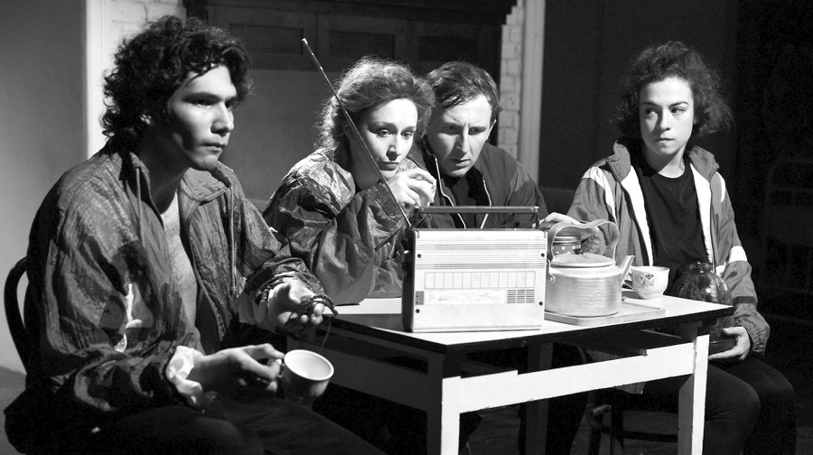 Весь спектакль состоит из микрособытий семьи в макрособытиях истории России. Каждая сцена — это эпизод на отрезке времени, на стену проецируется точный год (1902, 1914, 1917… 2002). Будто хроника. У каждого года есть свои приметы, поэтому читаются новости, прогноз погоды, звучит реклама, обсуждается какая-то важная покупка для семьи, украшается елка, накрывается стол. И в этом бурном течении времени сами люди не теряются, как в учебнике истории. Наоборот, вечно меняющееся пространство квартиры наполнено их переживаниями, их счастьем, их горем. Нередко все двенадцать актеров выходят на сцену вместе, чтобы коллективно пережить очередной виток истории. Квартира и становится местом со-бытия всех героев (художник Александр Якунин). Квартиру, наполненную книгами, игрушками, украшенную к Новому году, вскоре изрежут белые полосы — произойдет уплотнение, будут выстраиваться новые комнаты. Въедут новые жильцы, появятся новые звуки, новая мебель. Стеллаж книг уступит место еще одной кровати. Рядом повесят портрет вождя. Люстры заменят на простые лампочки. Большому круглому столу тоже не найдется места, теперь там будет стоять простой прямоугольный. Между белыми лентами-стенами постоянно будут ходить жильцы. Сделать зарядку, уйти на работу, выполнить домашнее задание и т. д. И все же в повседневную жизнь квартиры постоянно вторгается само время (и в программке действительно прописан такой герой, воплощенный хором). Страшный ночной звонок в дверь, пришли за отцом одной из семей. Рядом с пианино появляется буржуйка, на дрова для которой отдаются стулья. Вдоль всей сцены ставится длинный стол, сложенный из досок, — празднуется свадьба. Весь спектакль — это движение от счастья к несчастью и обратно.