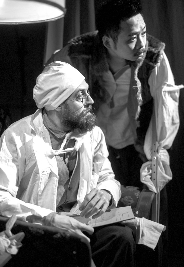 Театр сохраняет булгаковский сюжет, по сути, в первозданном виде (перенесение в современность здесь условно, только на уровне смыслов и места действия — красной «линчевской» комнаты). Кажется, что внутренние мотивы профессора Преображенского вполне проявлены — неприятие переделки общества на советский лад и в результате идея «нового человека», тоже искусственно переделанного уже по своему вкусу. Но если поддерживающий его доктор Борменталь (Олег Денисов) — выхолощенный шарж на молодого буржуа, а Зина (Софья Пачколина) — типичная хабалистая кухарка с походкой вразвалочку, то сам Преображенский в исполнении Алексея Артемова на карикатуру вовсе не похож, а в его занудном брюзжании о советской разрухе даже чувствуется правда сегодняшнего дня. Складывается впечатление, что в спектакле, тяготеющем к репликам в зал, Преображенскому отводится роль резонера. Однако после операции на Шарике Преображенский становится странной куклой, устраивающей стендапы под балалаечные мотивы.