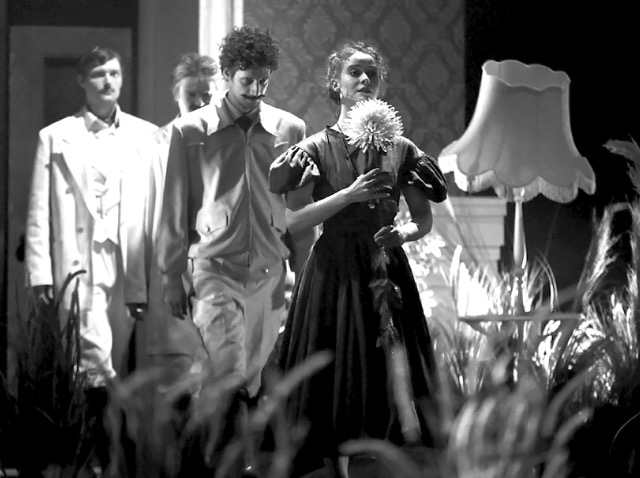 Актерских сил не хватает на то, чтобы герои были заметны среди сценических красивостей и странностей. Зинаида (я видела в этой роли Ирину Волкову) предстает хорошенькой, капризной, кокетливой барышней, но тайна ее притягательности, сила необыкновенной личности, «харизма» — ничего этого нет и в помине. Собственно, как нет и столь же необыкновенной личности отца Володи, человека умного, блестящего, до поры — равнодушного ко всему на свете, но сломанного и убитого своей неожиданной поздней страстью. Актер Денис Гильманов в этой роли остается в рамках все той же унылой клоунады, может быть, Дмитрий Ткаченко играет иначе.