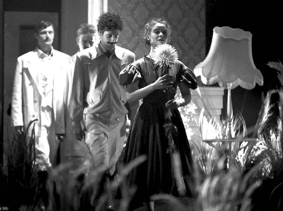 Зал смотрит хорошо, это правда. Зрелище впечатляет (особенно если не знать, что, например, камыши и сухие травы, проросшие сквозь паркет павильона, уже сценографический штамп). Музыка завораживает (мелодически затейливые и инструментально разнообразные сочинения Василия Тонковидова пропитывают все действие, тишины почти нет, вдобавок — регулярное воронье карканье). Условные приемы — развлекают. Режиссер выстраивает мир воспоминаний героя о своей давней юности как бы глазами тинейджера, которому взрослые фальшивые манеры и утомительные ритуалы кажутся неприятными и пустыми. Отсюда зацикленные повторения одних и тех же жестов и реплик во время семейных трапез (мать бесконечно требует: «Володя, соль! Володя, масло!»), механические движения и резвые пробежки туда-сюда двух слуг (почему-то в париках с косичками), истошные и тоже повторяющиеся призывы «Вонифатий!» из уст княгини Засекиной и проч. Стиль игры — как бы клоунада, хотя и не смешная. Все преувеличено, усилено, подчеркнуто и обведено. Фантасмагория должна была, допускаю, оттенять лирику — любовь Вольдемара к Зинаиде, но, увы, этого не происходит.
