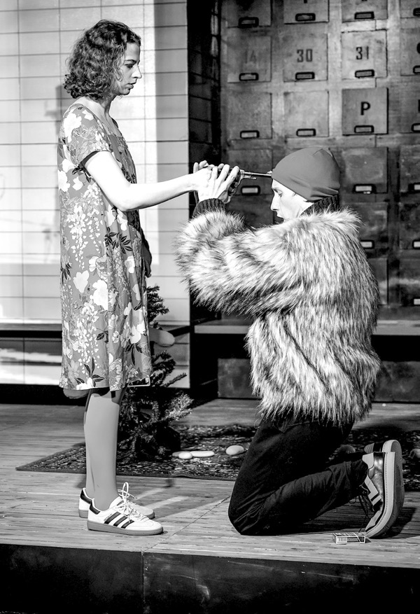 Действия пьесы разграничиваются то музыкальными вставками, то исповедальными стендап-монологами Ирины. «Почти комедия» Ворониной становится гимном экзистенциальной тоске, причем в первую очередь как будто бы женской. Мужчины здесь — странные, бессмысленно существующие персонажи. В центре должны быть, по ощущениям, кризис и распад, но получаются вполне знакомые несчастные типажи. Выделяются из всей серой массы героев в красивеньком вокзальном мирке два ярких персонажа — Ирина (Валерия Ледовских) и Соленый (Владислав Демьяненко). Валерия Ледовских дает череду постоянно сменяющихся полярных эмоций: смех, ухмылка, ярость, злость. Такой диапазон эмоций бунтующего подростка с максималистской, идеалистической мечтой. Демьяненко же создает образ Соленого как гоповатого, эпатажного парня, готового ради любви на многое. Психологическая наполненность ролей Соленого и Ирины доходит до пика в сцене, где они остаются тет-а-тет: и вот вроде бы все не так уж и бессмысленно…