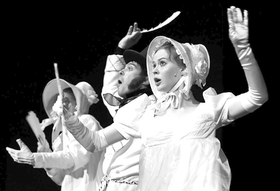 Режиссер Дмитрий Турков на сцене ТЮЗа сплетает биографию Пушкина с повестью «Метель». К мелодраматическому сюжету произведения прибавляется протяженный эпизод сватовства — от первой встречи с Натальей Гончаровой до (наконец) случившейся свадьбы. Интересно, что пушкинская женитьба представлена не с романтического, а с бюрократического ракурса — жених больше общается с будущей тещей и императором, чем со своей невестой. Кажется, режиссер захвачен страстными взаимоотношениями поэта не с Натали, а с Николаем I. Эта интереснейшая и противоречивая тема — странная, мучительная связь художника и власти — в спектакле действительно звучит, но еле слышно. В остальном — щупальца общетюзовской традиции плотно проникли в сознание режиссера и в спектакль про «солнце русской поэзии». Поэтому, конечно, Пушкин с пером и густыми баками. Конечно, вокруг щебечут прекрасные девушки в белоснежных платьях и чепчиках. Сценография представляет собой причудливую кольцеобразную конструкцию из широких лестниц, потому что на ней: 1) удобно бегать влюбленным, 2) комфортно страдать на балконе, 3) сподручно изображать странствия через метель.