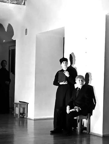 Сценическую композицию центрует и замыкает на себе старый, мудрый Игорь Николаевич Ясулович. В роли византийского интеллигента Ермия он совсем ничего не делает. Сидит с книжкой Лескова в руках и негромко читает текст сказания, не заботясь о личном актерском успехе и не беспокоясь о впечатлении, которое произведет его чтение. Он пребывает далеко и высоко — там, где такие мелочи не будоражат душу и не разогревают огня в крови. Оттуда, с немыслимой и непредставимой высоты, он доносит до зрителя не «слова—слова-слова», но смыслы слов. Мужественная, сильная, простая и в высшей степени логосная игра. Роль-восхождение, последняя в жизни артиста. Сейчас в спектакле звучит только его голос и еще — тень на стене. Оставить такой нестираемый след на земле дорогого стоит. Это единственный известный мне случай, когда образ ушедшего от нас артиста режиссер сохранил как живую художественную реальность.