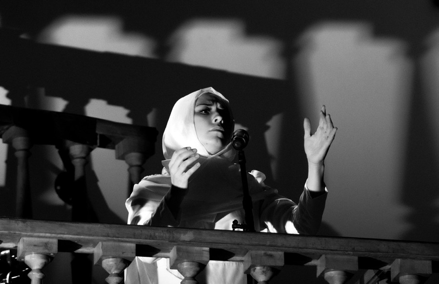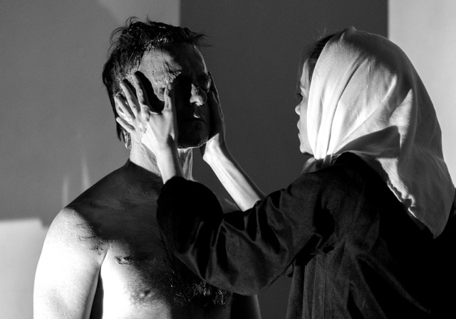 Надежда на возможность преодоления разрыва между вышним и нижним, небесным и земным, божественным и человеческим «сквозит и тайно светит» в музыке спектакля. Житейская скороговорка гармонизирована с житийным речитативом, охальный частушечный выкрик — с негромким молитвенным чтением, экспрессивность реплик и восклицаний — со спокойным разговорным окрасом монологов. Телесная жизнь ритмизована и подана с изумительной пластичностью. Руки тоже звучат на разные голоса: недоуменно вопрошают, негодующе протестуют, кротко умоляют, мягко упрашивают, тихонько увещевают, горестно вздымаются, оживленно жестикулируют, резко отказывают, берут паузу и молчаливо покоятся на коленях. Византийские распевы, восходящие к временам Романа Сладкопевца и Андрея Критского, одухотворяют речевую полифонию и опрозрачнивают грубую материю театра. Заметим, что исполнение псалмов лишено филармонического привкуса; театральный хор ориентирован не на концертный исполнительский стиль, а на суровое соборное моление братии Валаамской обители.