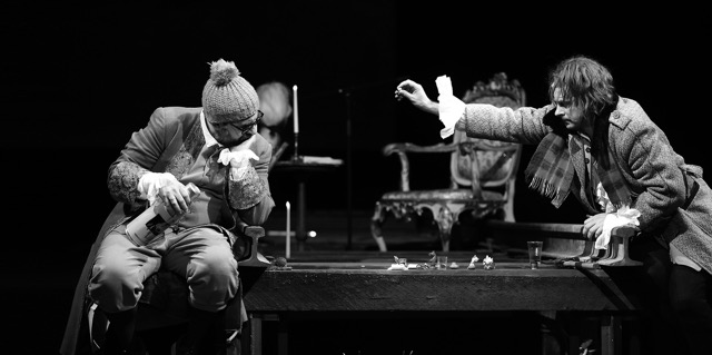 Я попробовала зафиксировать то, что происходило на спектакле 12 февраля. От спектакля 29 декабря не столько воспоминания, сколько ощущение — наверное, большей легкости во взаимодействии участников, большего «здесь и сейчас» присутствия, моментов и ситуаций, когда было очевидно, что артист сделал на сцене что-то неожиданное для своего партнера и тот спонтанно отреагировал. Я не смогу поручиться за то, что 29 декабря умирал, например, Сальери. Или за то, что гэг с «походами» к жене обыгрывался во втором действии, а не в первом.