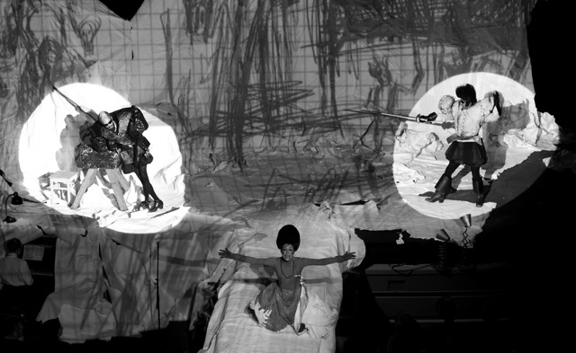 Марионетки с утрированными пластикой и голосами мяукают, завывают и рычат. Смотреть и слушать монотонно-карикатурное исполнение текста в течение часа почти невыносимо. Поневоле задумываешься о том, что уроки Татьяны Кирилловны прошли для Васи-режиссера даром. Получается, чуткий исключительно к своим переживаниям, он редкостно нечуток ни к языку страсти, ни к поэтическому слову. А то, что Вася—Командор функционально за скобками бумажного театрика, не позволяет выявить каких-то драматических противоречий в сознании героя.