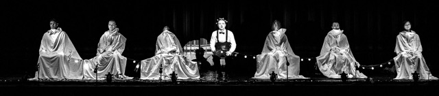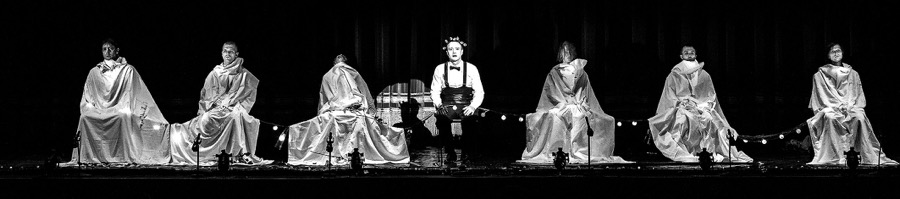 Распад мира — распад текста. Речь возвращается к мертвецам не сразу, звуки точно размораживаются, сначала слышатся отдельные полувсхлипы-полувскрики, перемежающиеся общим протяжным «ааааа», пока по просьбе Вальсингама Алена Кучкова тихо и нежно не начнет выводить песню Мери, поминальный плач, голос ее крепнет, охватывает зал. Битбокс Кандинова подхватывает вокал Кучковой (композиторы спектакля — Антон Колбин, Арсений Бехтерев).