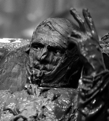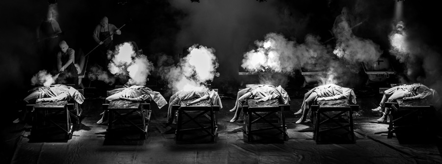 Но время для мертвецов идет вспять. Начинается эксгумация трупов, антиритуал, в котором погребение проворачивается в обратном порядке. Прицельно бьющий сверху вниз, точно в морге, свет прожекторов высвечивает полуразложившиеся тела в истлевших лохмотьях, покрытые жидкой грязью. И только один труп — рыжеволосой девушки в платье с цветочным принтом — свежий. Люди в костюмах химзащиты извлекают тела из гробов, посыпают известью, моют, уложив на столы (будто сервируют ими), переодевают в чистые саваны, вручают свечи и высаживают вдоль линии рампы для последней трапезы.