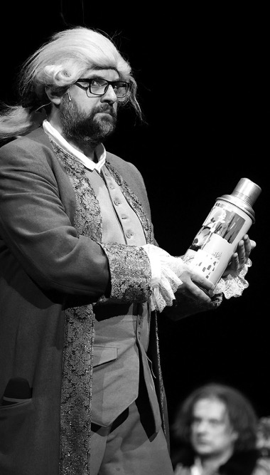 Однако «тон» всякий раз задает Сальери. Юринов садится за фортепиано, исполняя «Там, где клен шумит» глубоким баритоном. А красивый голос, как бы мы ни относились к творчеству ВИА «Синяя птица», это всегда власть, которой ты не можешь противиться. Пока Сальери раз за разом пытается произнести свой монолог в духе «театра старых мастеров», нарциссично упиваясь мелодикой и ритмом, постепенно входя в раж и подбавляя рокочущих модуляций «от Высоцкого»: «Где ж правда?», Феськов невпопад оказывается на сцене, роняет молоток, на цыпочках, а потом ползком движется в сторону туалета. И чем более Моцарт пытается быть незаметным, тем больше внимания он привлекает своей беззвучной пантомимой, тем больше своей неуклюжестью заостряет высокопарный слог Сальери, заставляет его срываться и начинать монолог о зависти раз за разом.