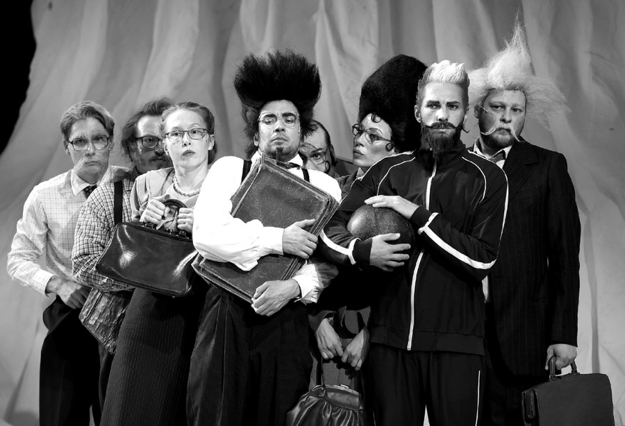 Вася Сизов — студент РГИСИ Дмитрий Шумаев — с его нежно-пухлыми губами и шапкой русых волос легко берет зал в сообщники, немного сбивчиво рассказывая о себе и попутно представляя школьных учителей, которые один за другим появляются на сцене. Нелепые персонажи-маски в ярких гримах и причудливо всклокоченных париках, похожие не то на ярких аквариумных рыб, не то на экзотических птиц, терпеливо высаживаются на «скамейку запасных», переглядываясь в ожидании своего выхода. Прибухивающая «француженка» Анна Павловна (Елена Осипова), которая вообще-то химичка, исподтишка прикладывается к фляжке. По-петушиному яркий физрук Артем Петрович (Виктор Княжев) гордо оглядывает свой «курятник». Информатик, который ставит «три» тем, кто играет в игры на уроках, а «пять» тем, кто научился лепить сайты в Тильде. Учительница литературы Татьяна Кирилловна (Полина Дудкина), тихоня в аккуратной блузке и очках, с нежно-голубыми висками. И разный другой яркий народ. «Фрикозоиды мои», — почти любовно характеризует их Вася.