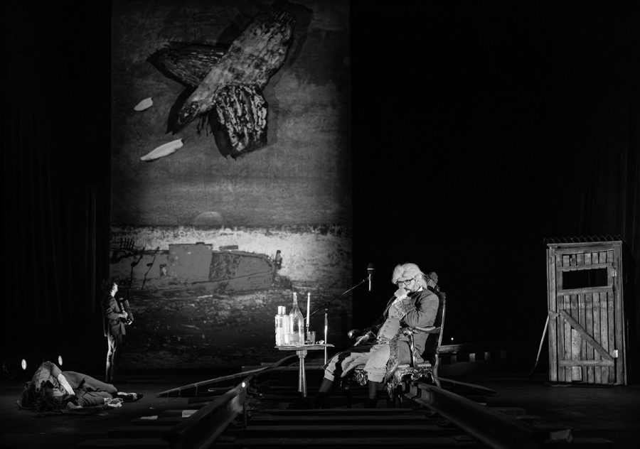 То ли начинаясь, то ли теряясь где-то в полутьме закулисья, кое-где подсвеченные электрическими свечками, в край сцены упираются рельсы, образуя своего рода тупик. В конце ветки, примостившись на обрыве железнодорожного полотна, актеры разыгрывают одну и ту же шахматную партию, в которой Моцарт отбивает каждый ход ударом молотка о рельс. Шахматами в игре служит всякий случайный хлам: конфеты, фантиками которых шуршит, поедая «фигуры», Моцарт, или наперстки. По центру, прямо на рельсах, роскошное, хоть и видавшее виды, кресло с торчащей из него набивкой — опорный пункт Сальери. Справа покосившееся дощатое сооружение с окошком — то ли туалет, то ли сарай для перегонного аппарата, из которого Сальери выносит бутыль с мутной жидкостью, чтобы угостить Моцарта в «Золотом льве». У фортепиано слева человек в валенках и трениках, но в черном кудрявом парике, которого представляют нам как Володю (музыкант и композитор Владимир Розанов), он же Александр Сергеевич (Пушкин), он же «слепой скрыпач». Костюмы главных героев — микст. Роскошный камзол, шапка с помпоном и кеды; небрежный шарфик и драповое пальтецо, из-под которого выглядывает кружево сорочки. Но мы точно не перепутаем, кто есть кто. Долговязый, нескладный, взлохмаченный Феськов — Моцарт. Осанистый красавец Юринов с бархатным баритоном — Сальери. Они весь вечер на арене, как Рыжий и Белый, как Ипполит и Лукашин, как Розенкранц и Гильденстерн с их игрой в орлянку/шахматы. Володя/Саша чуть в стороне, скромно-улыбчивый, он не только музыкант, аккомпаниатор, но и «свидетель», естественностью своего присутствия и реакций остраняющий лицедейство дуэта Юринова — Феськова.