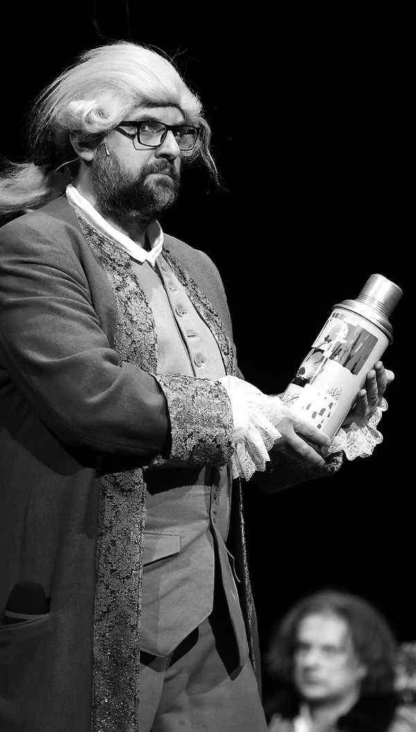 Наверное, главная прелесть этого спектакля (когда он идет хорошо) — в постоянной осцилляции между плотностью маски и легкостью актерского присутствия, между «жыром» удачного гэга и какими-то более летучими веществами. «Ты, Моцарт, бог», — со всеми положенными драматическими интонациями говорит Сальери.