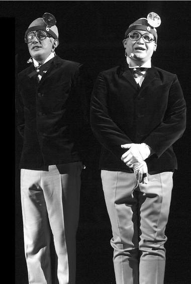 Вес второго акта взять труднее. Толпа странных, одинаково одетых то ли потусторонних существ, то ли, напротив, людей будущего с головами а-ля «груши конференц» отсылает нас к театру, в котором главенствует моль, а нафталин еще не придуман химиками. Доморощенные фрейдисты по большей части хором лапидарно повторяют ключевые для драматурга слова: «суподас разъедает внусок, суподас придавил внусок, разрыв внуска». Герой мечется между строго выполняющими волю постановщика товарищами артистами, произносящими неудобоваримый бредовый текст.