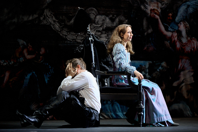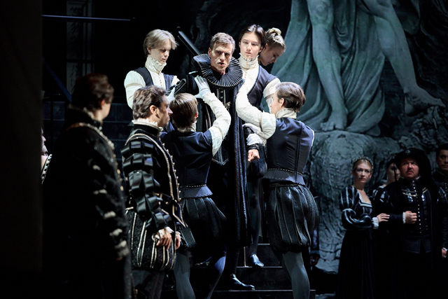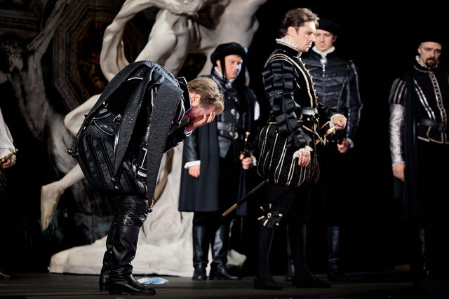 В этом спектакле во время увертюры рассказывается предыстория — что случилось до того, как бунтовавший против герцога и выпущенный из-под ареста граф Монтероне (Сергей Теленков) обнаруживает, что его свобода досталась ему ценой чести дочери, и проклинает герцога и его приспешников. Собственно, ничего неожиданного в этой предыстории нет: дочь бунтовщика является к правителю, чтобы просить за отца — и герцог игриво развязывает ей поясок. Сцена необязательная, но и не катастрофически лишняя — очевидно, что нечто такое в предсобытиях и подразумевалось. Еще одна новая идея — то, что от природы шут не горбат. Он надевает горб, когда отправляется на работу, ко двору герцога — и это тоже не вызывает никакого удивления. Слегка раздражает неточность, допущенная художницей: она водружает на сцену скульптуру «в духе Бернини», но Бернини жил в XVII веке, а события оперы происходят на сто лет раньше. Собственно, мы даже знаем годы жизни человека, ставшего прототипом герцога: французский король Франциск I (выведенный под своим именем в пьесе Гюго «Король забавляется», давшей сюжетную основу для оперы) жил в 1494–1547 годах. Ни о каком Бернини еще и речи не было; и нет, это не мелочь — если спектакль выпускается «в старинном духе», его авторы должны точно представлять себе, о какой именно старине идет речь.