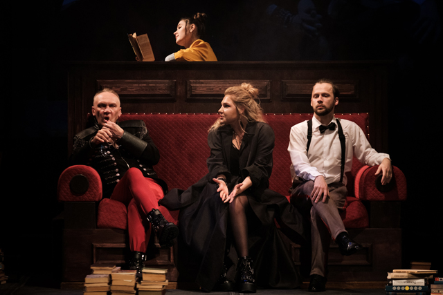 Чтение превращается из признака ума в симптом начетничества. Эта метафора работает интересно, но неравномерно: в отдельных эпизодах идея «жизни по написанному» выражена слишком буквально, и сцены начинают дублировать друг друга. Действие буксует, рисунок эпизодов остается одинаковым — короткий монолог, музыкальная вставка, парная сцена. Возникает ощущение, что спектакль немного застрял в собственном ритме — как и его персонажи в страницах книг.