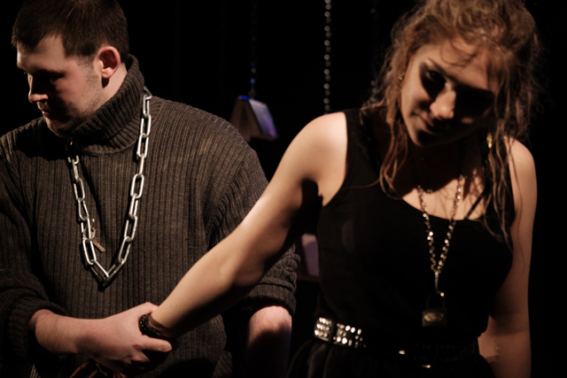 Спектакль начинается с кошмара горничной Лизы (Ксения Авдеева), заснувшей во время чтения: каждый персонаж грибоедовской комедии появляется с книгой и беззвучно и экспрессивно читает — строчки «Горя от ума» или просто вызубренные постулаты, все одно. Герои застряли внутри прописных истин, которые перестали работать, как в замкнутом механизме, — этот образ станет основным на протяжении всего спектакля. Разглядев кукольное безволие чтецов, Лиза просыпается от собственного крика, но кошмар, как водится, не заканчивается и воплощается наяву. Зависимость от текста становится аналогией слепому следованию кем-то когда-то сформулированным истинам, которые давно утратили свою достоверность.