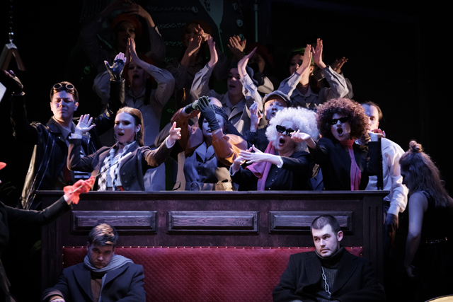 Фамусов (Сергей Дубовиков) — эксцентричный престарелый рокер, похожий на Фредди Меркьюри и бесконечно таскающий за собой микрофон на стойке, — может быть, когда-то он и сам был бунтарем против системы, но со временем превратился в шута. Его дочь Софья (Анастасия Ковальская), столь же экспрессивная и чувственная, наследует не только похотливость его страсти, но и его позерство. Вообще, весь грибоедовский мир у Баркара обладает легким флером олдскульного рока.