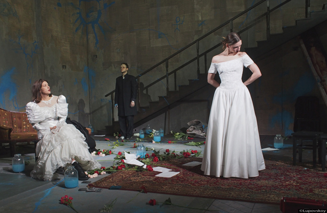 В ее диалоге с Настасьей возникает одна из кульминаций спектакля. Обе предстают в белых свадебных платьях, обе изощренно грызутся за князя, а предмет их соперничества в это время едва стоит на ногах в сторонке, уже похожий на дегенерата: и взгляд остекленел, и слюна стекает по подбородку. Сцена и смешна, и страшна, и отдает откровенным абсурдом. Меняет регистры игры и Стеклов-Рогожин: то откровенно ерничает, то по-мужицки разгуливается, то становится скорбным и даже смиренным, кода они с князем, стоя на коленях, соприкасаются нательными крестами. Только сам Волков-Мышкин существует иначе. Он в этом почти гамлетовом мире, где отчетливо пахнет могильной землей, — будто тонкий инструмент, на котором «играть нельзя». Но все играют.