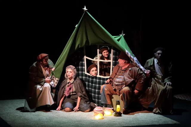 Художник спектакля Мария Васильева создает на сцене волшебный, узнаваемый каждым мир детства. Сюжетно пространство сцены — это и лес, и поле, и реки, и овраги… Зрители этого не видят, но это легко представляется — пространство действует ассоциациями: нам дорого и близко все, что мы видим, все вызывает в нас теплые воспоминания о чем-то очень дорогом. Декораций немного, практически все они в воздухе: с колосников струятся шторки-облачка из множества переливающихся белых ниточек, меж которых восходит яркий, как долька апельсина, месяц. А еще облачка — это уходящие в небо кроны деревьев, держащиеся за землю вязаными, теплыми шерстяными и плюшевыми стволами. Планшет устлан ковриками разных фактур, цветов, размеров, форм. У портала слева притаился домик-палатка Медвежонка, он похож на тот, какой строят дети, набрасывая на столы и стулья одеяла и покрывала. На сцене одновременно и рукотворная игрушка, и рукотворный мир, укутанный от холодных рос, долгих осенних и зимних ночей, студеных ветров. Мир, который герои могут потрогать, понюхать, послушать, с которым они могут подружиться. Это мир, в котором невозможно не мечтать, не летать: когда Заяц (Владимир Кшуманев), поборов страх, забирается на сосну, чтобы посмотреть на заходящее весеннее солнце, Белка (Татьяна Иванова) нажимает кнопочки на панели управления, и облачка-ниточки спускаются прямо к ногам Зайца — он словно парит над ними, ощущая себя частью бескрайнего неба.