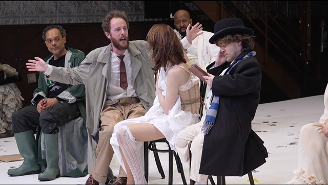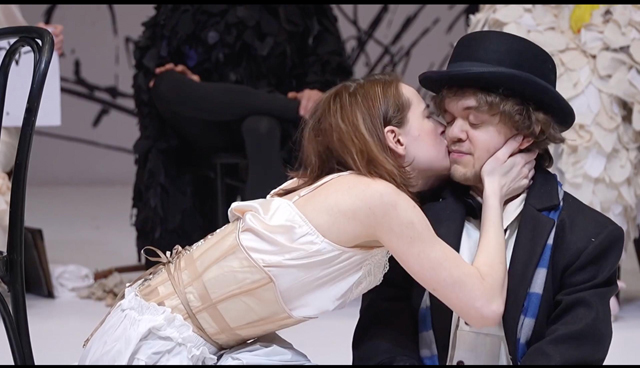 Один стул выдвинут на авансцену. Елена (Shelby Flannery) в черном платье и шляпе пересечет белый квадрат сцены и займет его.