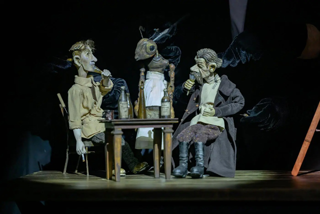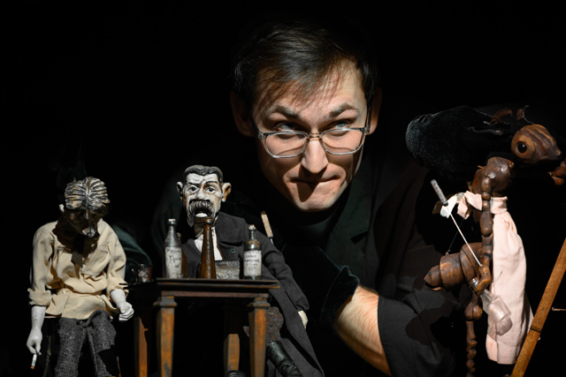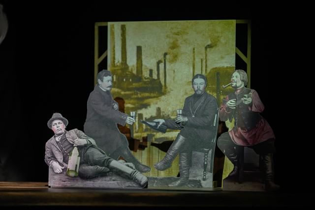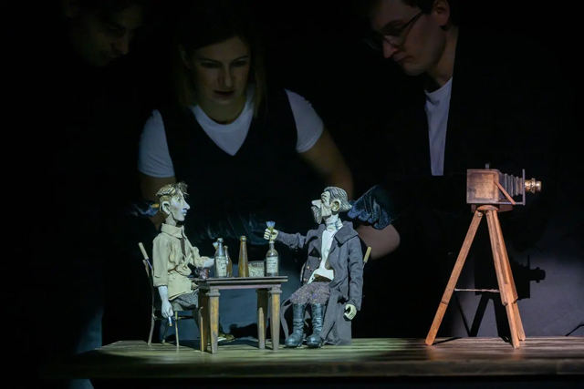 Трогательный мир тростевых кукол: мальчика-фотографа, его усатого кумира с сигаретой и, наконец, друга-Муравья, который будет то умильно позировать перед камерой, то в фартучке прислуживать за столиком, создала Мария Кривцова, а оживили прекрасные артисты Любовь Савичева и Дмитрий Половников. Режиссер и Драматург тоже наденут черные бархатные перчатки, чтобы включаться в эту игру и передвигать шарнирные ножки и ручки своих героев. Максим Горький будет по-шагаловски парить над картонной Москвой, его двойник — выпивать на брудершафт с фотографом, чтобы ночью «обнести» гостеприимную квартирку, Муравей — задумчиво вздыхать и покачивать головкой с усиками, сопереживая. На каждый «щелк» затвора режиссер будет выводить на отдельно стоящий поодаль лайт-бокс фотокарточку: вот он — сидящий нога на ногу Муравьишка, вот она — смазанная на лету Москва, вот он — автопортрет фотографа с приклеенными «ницшеанскими» усами.