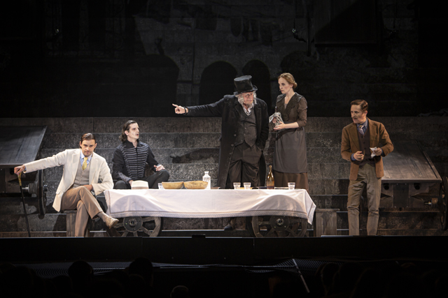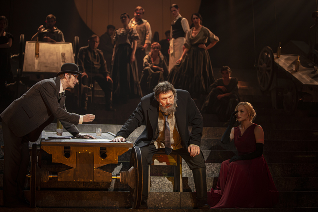 Что же «слепили» в Петербурге — 2025? Нечто серьезное и монументальное, хотя и с юмором, доведенным до фарса, с обостренным жанровым определением, в котором слова «комедия» и «трагедия» равно уместны. Новый для театра постановщик, главный режиссер Московского драматического театра им. А. С. Пушкина Евгений Писарев, в содружестве с художником Зиновием Марголиным перевели такой вроде бы сочный, бытовой сюжет про бандитские разборки и дележ наследства в разряд вечных. Не только о столкновении поколений, непонимании отцов и детей здесь речь. Речь о предательстве в библейском смысле. Отец предает семью, жену, сыновей, дочь, и ищет свободы в дальних краях и новой любви; сыновья платят ненавистью. По сути, здесь все искорежены и одержимы. По всем проехалась телега жизни. Буквально. Переехала корявыми деревянными колесами с набитыми на них досками. Телег на сцене немало, они то зависают на тросах в воздухе, то опускаются и устанавливаются на площадке — и кажется еще, что это столы на колесах (их накрывают скатертями и уставляют снедью), кровати (накидывают простыни, кладут подушки), а еще катафалки или гробы (в начале спектакля Арье Лейб вещает со стены еврейского кладбища)… Основное пространство сцены занимает высокий подиум наподобие Потемкинской лестницы, выстроенный во всю ширь сцены и поднимающийся почти под колосники. Наверху остается только место для желтого круга Луны — того спутника Земли, что освещает ночь. Знаменитая сцена «Делай ночь, Нехама» воспринимается вполне зловеще — ночь и так ночь. Делать нечего. День в этом спектакле так и не наступит. Есть, конечно, софиты, и их свет заливает сцену, но вокруг глухой черный кабинет, и будто нет в мире ничего, кроме ступеней, по которым герои идут наверх или спускаются вниз — совершают свой жизненный путь.
