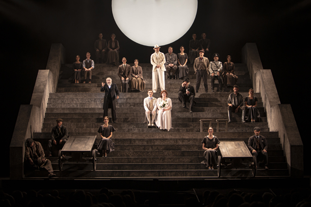 Если бы лестница образовывала полукруг, ассоциация с античным театром была бы явной, но она все равно есть. По лаконичности и объемности картинки, по накалу и обобщенности чувств, которые транслируют герои. Даже при отсутствии прямой архитектурной цитаты понятно, что страсти греческой трагедии будоражили фантазию постановщиков, так же как шекспировский размах событий, так же как открытый взрыв эмоций площадного театра. Ассоциативный круг можно расширять, и он высокой театральной пробы.