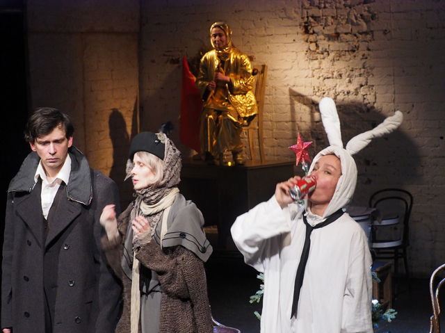 Этот кролик в исполнении Екатерины Кирчак — обитатель пространства с кирпичной фронтальной стеной, двумя потасканными диванами, тусклым ковром, золоченой статуей со снопом, сошедшей с монументальных композиций ВДНХ, и картиной Саврасова «Грачи прилетели». В это пространство по ходу спектакля будут входить, врываться, вбегать герои романа «Доктор Живаго», обживаться в нем, танцевать, любить и мучиться. И поначалу кролик даже станет здороваться с ними, снимать их на камеру, удивляться, пытаться их понять. Но чем дальше будет двигаться действие, тем меньше будет в нем интереса, все чаще он будет просто понуро смотреть на недоступные ему вихляния нелогичной русской души, бессильно съезжать по стене у бокового портала с немым отчаянием приговоренного видеть.