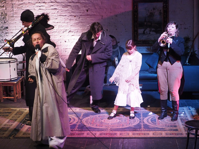 Пересечение «американской» и «русской» линий спектакля происходит как бы исподволь еще и в музыкальной, очень значительной части спектакля. И если поначалу медные духовые накладываются на минусовку откуда-то из-за кулис, то позже оказывается, что Живаго, Павел, Священник и многие другие персонажи спектакля готовы взять в руки трубу, тромбон, валторну и поддержать изливающего свои страдания Квентина.
