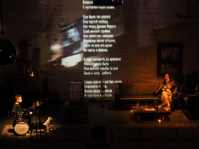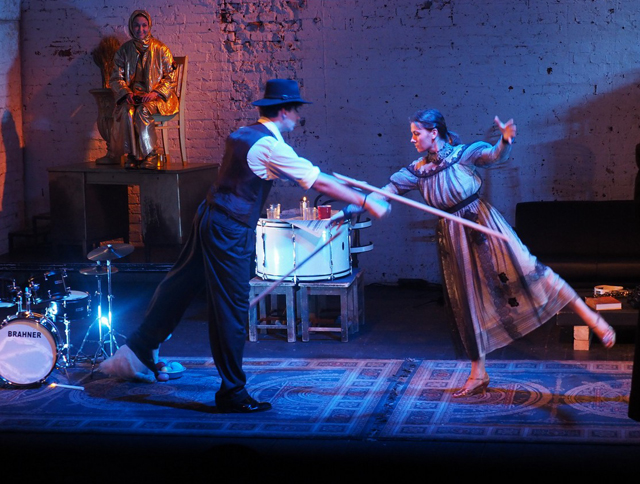 Для спектакля Александры Толстошевой это «над» первично. Спектакль будто никак не может начаться, и на первые двадцать минут сценического времени приходится целых два затакта, перемежающихся то объявлением о необходимости выключить мобильные телефоны, то сообщением о том, что «вот теперь начнется спектакль». За это время оживает золоченая статуя со снопом, Лара (Мария Погребничко) произносит текст «дверь с улицы настежь, в комнате люди, гроб, в гробу покойник», на что кролик разражается подобающим «My Way», но заканчивает рыданиями. Над спектаклем нависает опасность поэтического вечера с высоким градусом чтецкого мастерства — практически встык идут два стихотворения в блестящем исполнении Елены Павловой — но в промежутке кролику нужно закурить, а еще он ужасно хочет найти в Москве кока-колу или хотя бы пепси, но его бодрый английский совсем не в помощь. Американская история, поддержанная проекцией знаменитого голливудского знака, продолжается изящным танцем Живаго (Даниил Богомолов) и Лары под «Unforgettable» в тонком, с выверенной долей иронии и тоски, исполнении кролика в сопровождении медных духовых, спрятанных где-то за кулисами. Игра в ассоциации запутывает и намеренно вычерчена нетвердой рукой. Но зритель успевает понять, что пунктир по роману Пастернака будет очень неявным и авторским, развития традиционного сюжета ждать бессмысленно, а американский кинематограф каким-то неуловимым образом влияет на этого «Доктора Живаго».