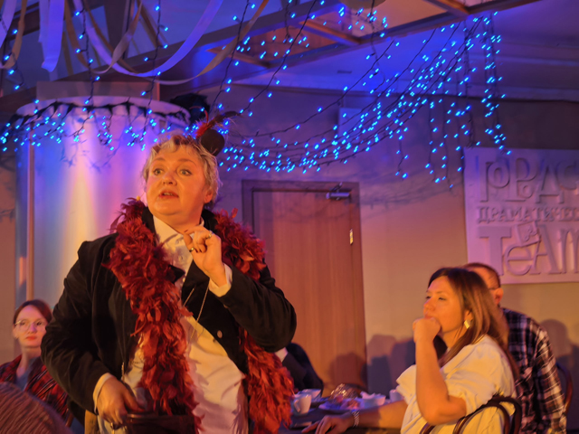 А вечером другая актриса-клоунесса, Елена Калаганова (Казанский ТЮЗ), пропутешествовала по всей истории XX века вместе со своей героиней — гувернанткой Шарлоттой Ивановной из пьесы Ирины Васьковской «Счастливая Шарлотта» (режиссер Радион Букаев). Спектакль этот и сам путешествует по российским и международным фестивалям, и заставляет критиков и зрителей восхищаться легкостью актерского существования, актерским обаянием и импровизационностью. Потому что каждый спектакль непредсказуем и зависит от настроения публики, как зависела от всех и сама героиня Калагановой, Шарлотта Ивановна. Дело в том, что он играется в барах, рюмочных и других видах питейных заведений. В одном из городов Шарлотте пришлось присесть на колени к мужчине, в другом — с ней в диалог вступила рыжая собачка, которая живо реагировала на немецкие фразы. То есть каждый спектакль — это путешествие в незнаемое. Актриса справляется с новыми обстоятельствами блестяще. Здесь ей пришлось преодолевать еще и физические препятствия: столы и стулья в фойе театра были поставлены так плотно (чтобы усадить всех желающих), что ей приходилось буквально протискиваться между столиками. Но что же делать, такова жизнь чеховской Шарлотты — фокусницы, танцовщицы, сестрички Эйфелевой башни. Обе они родились в 1889 году, да еще и в один день. Так что возраст героини… ну, как бы она без возраста.