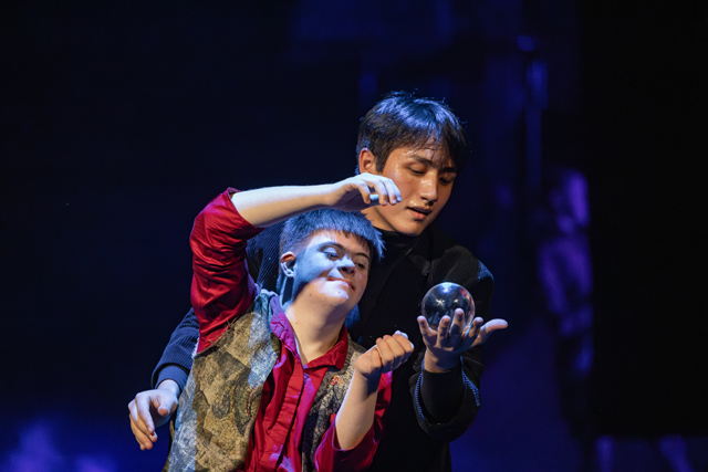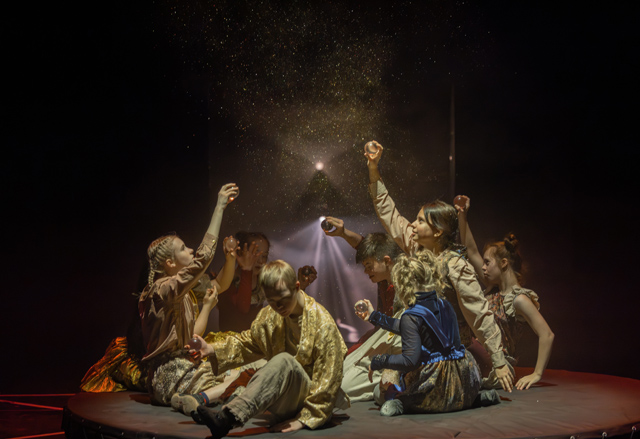 Герои этого спектакля — странствующие дзанни, ваганты, гистрионы, скоморохи. В их костюмах (художник по костюмам Юлия Шаркина) — отблески разных культур и эпох, комедии дель арте и кинематографа Чарли Чаплина. Их выступления — как будто часть привычной жизни, естественного существования. Им в радость устроить кутерьму, взобраться на трапецию, раскидать шары, прошествовать перед публикой в шляпе, из которой фонтаном летят мыльные пузыри. Они могут высыпать на сцену шаловливой гурьбой или, сгрудившись в кучку, неслышно и загадочно шептаться. Персонажи этого спектакля всегда как бы вместе, перетекают от сцены к сцене, вдруг мелькают силуэтами на заднике или на мгновение проявляются в световом луче. Там, где кто-то в дуэте или солирует, всегда есть другие артисты-создатели этого пространства, мягко и трогательно обозначающие свое присутствие.