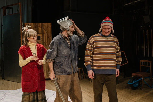 Татьяна Родина, напротив, взяв в подруги почти юного драматурга Владу Мицукову, а в соратники прекрасную труппу нижневартовского Городского театра, всегда отличавшуюся отличным сценическим юмором (это подтвердит любой, кто видел «Посадить дерево» М. и В. Зайчиковых или «Хочу в Париж» и «Урожай» Зайчикова В.), поставила спектакль о возможности нелепого и прекрасного донкихотства. О том, что оно растет где угодно, хоть на краю света. Хоть в богом забытом ДК поселка Верхняя ЛаманчА, «оборудованном по последнему слову техники» единственным проектором, с помощью которого можно показывать слайды на лекции про Сервантеса… А когда проектор выключается — тоже ничего, ведь можно «подключить фантазию»!