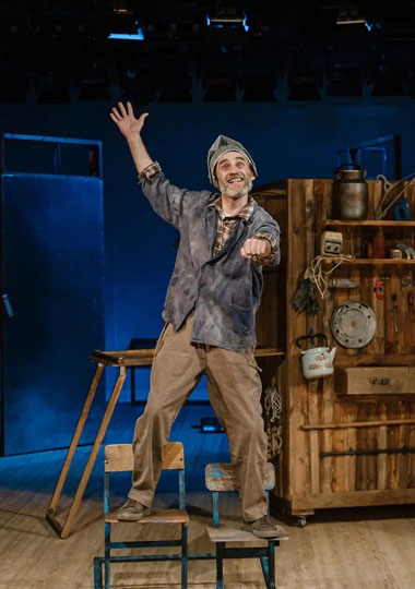 Дальше они с Санчо выпьют в своей каптерке, поскачут на стульях (отличный этюд) — и тут в спектакль ворвется музыка из «Человека из Ламанчи». Вот тут электрики Санчо и Кехо (отвечающие, между прочим, за свет!) станут настоящими героями романа, водка и игра сделают их почти настоящими персонажами. Кехо — Абачараев откажет даме-спонсору-дракону Альтисидоре Дункановне (Евгения Цариценская), его будут преследовать, злые силы ДК и примкнувший к ним животновод Педро Петров привяжут его к железному стулу, он почти умрет — а в библиотеке ДК случится пожар (короткое замыкание!). Символического смысла никто не поймет, крайним окажется электрик, торжествующие прагматики уведут неформатного работника, обвинив его в поджоге. Но все успеет случиться: объяснение с Дульсинеей, еще раз клятва посвящения в рыцари… А когда Кехо уведут, возникнет Адреас и предложит Евдокии Тобольтовне свою защиту. Примет эстафету. Благодарная, она посадит подростка смотреть диафильм о Дон Кихоте, а тут набегут и остальные дети в обгорелых рубашонках, перепачканные сажей…