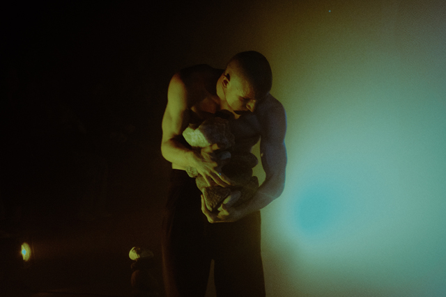 Грунтовская быстро собирает внимание обратно — в том числе строя спектакль как спиралевидную конструкцию. В противоположность названию, «Камень» упорядочен и делится на небольшие эпизоды, которые сопровождает одна и та же разбивка: танцовщик Тимур Ганеев перекладывает камни. Так в постановке образуется два действенных пространства: условно-свободный, более спонтанный на глаз танец и дисциплинированное раскладывание камней. Что бы ни происходило в одном — бег, работа в партере, сложные поддержки, разбрасывание тел, — в другом в свой час единственный человек соберет камни и переложит их в новую конфигурацию. Партию Тимура Ганеева можно сравнить с природной силой, так он непоколебим, спокоен и упорен в миссии. Что бы ни произошло, камни в свое время будут собраны и в свое разложены.