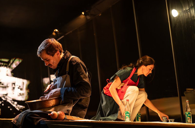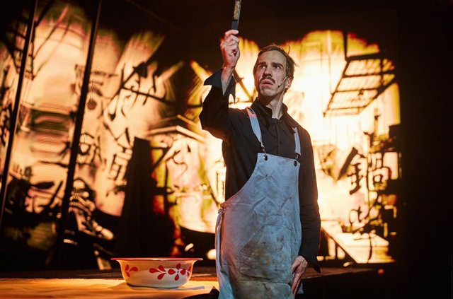Очень выразительна в двух мужских ролях Анастасия Белинская. Это тот редкий случай, когда женская травестия не нелепа, а точна и обаятельна. Актриса играет попеременно то трусоватого и жалкого отца Минляна — Чэнь Чжанце, то наставника мальчика по приготовлению свиных лыток — Лао Чжу, милого и трогательного наставника всей его жизни. В обеих ролях она меняется и внешне, и внутренне, играет и возраст, и старение. Выдают ее только красивые ухоженные руки. Но это нисколько не мешает, скорее восхищает. Это такой прозрачный намек на актерское перевоплощение.