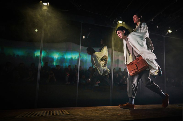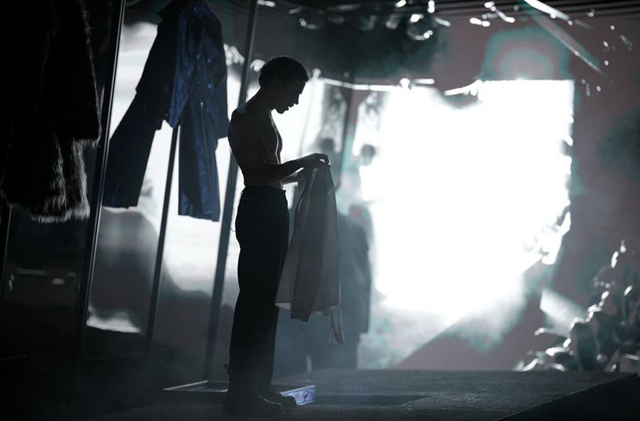Длинный помост протянулся от сцены через весь зал (художник Лю Кэдун, ассистент художника Цай Жожань). Если в первой, китайской постановке у Дин Итэна было 2000 зрителей, то здесь от и без того небольшого зала осталось всего 70 мест. Помост был ограничен с одной стороны прозрачными стенами, где иногда возникали виды старого города, немного размытые и расфокусированные, а с двух краев его ограничивали два экрана, на которых возникали разные фотографии, надписи, картины. Позади двух или трех зрительских рядов тоже иногда возникали изображения, появлялись герои и шли какие-то сцены. То есть мир Яньцзиня охватывал зрителей со всех сторон — мы оказывались как будто внутри этого города (видеохудожник Игорь Домашкевич отлично придумал этот мир).