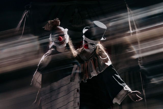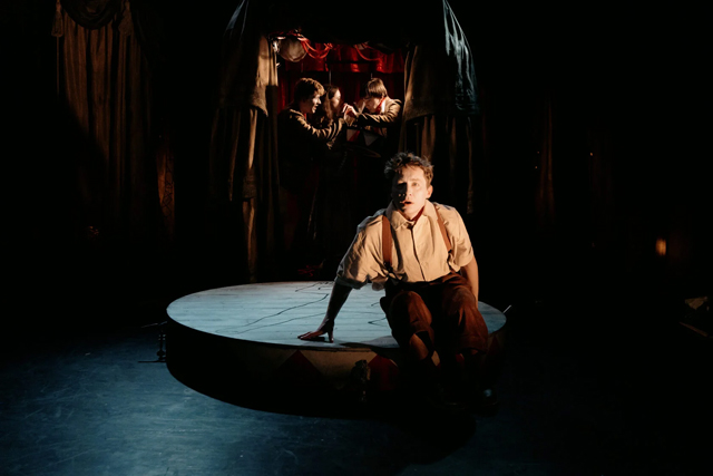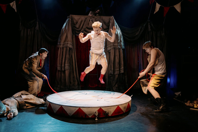 Трезвый и ироничный ум героя постепенно преобразился в коварный, животный, жестокий. Сцена близости Марии и Оскара происходит уже не под юбкой, а на арене, открыто и бесстыдно. Молодая хрупкая, изящная девушка и сильный красивый мужчина небольшого роста и в прекрасной форме наслаждаются друг другом. Нет ничего, что выдавало бы в Оскаре ребенка, не работает и обтягивающий старомодный полосатый купальный костюм, но зрители должны помнить — Оскар все еще по сюжету выглядит, как трехлетка. И если ранее интимные сцены были обыграны иначе — красным пространством в раздвигающихся полах юбки, карточной игрой на троих на вершине арки-шатра, — то к финалу спектакля любая метафоричность исчезает. Куклы становятся людьми из плоти, любая искренность и чувственность пропадает. Вероятно, из-за влияющей на вечного мальчика нелюбви и жестокости не только дома, но и всего мира. Оскар превращается в такого же серого, злого, гнусного, не думающего и не чувствующего человека, но этот путь остается скрыт от зрителя за флажками и рюшами, масками и ужимками.