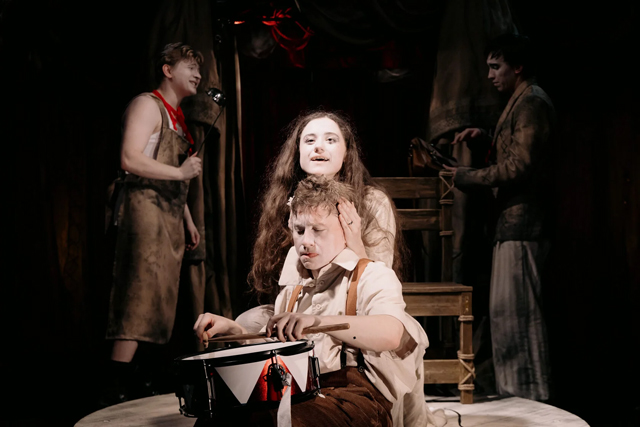 Барабан — символ жизни Оскара. Барабанный бой — голос Оскара, его счастье и истерика, его способ быть частью мира; так бьется его сердце, он призван задавать живую ритмику спектакля, наделять его истинным зловещим голосом. Барабанный бой — голос войны, тревоги, отсчет до прихода вечности. Так в спектакле соединяются детство и оккупация, а хрупкость и беспомощность героев ощущаются сильнее и тревожнее.