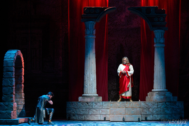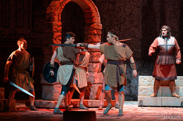 3 не в счет. Любопытно, что «Гладиатор» местами транслирует подходы барочной оперы: всего шесть сольных партий, очень скромная роль хора (ансамбль в основном танцует и фехтует), а костюмы содержат элементы более поздних эпох (корсеты у женщин, штаны и сапоги у мужчин) — ну а пышный плюмаж у распорядителя игр в Колизее и вовсе однозначно принадлежит театру XVIII века.