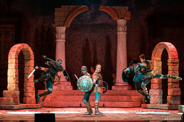 Зато спектакль берет пластикой. Многочисленные танцевальные номера решены с таким яростным задором, словно «балет „Спартак“ есть у нас дома»: здесь и пляски менад, и кружение то ли жриц, то ли духов, к которым обращается в молитве Луция, и развлечения гладиаторов с рабынями. Важная составляющая спектаклей СТМ — бои, и здесь они поставлены на уровне хорошей исторической реконструкции, даже мечи используются стальные: при соударениях от них летят искры. Вопросы вызывает только сцена символического боя Максимуса с Минотавром: слишком уж неуверенно двигается артист в ограничивающем движение и обзор костюме чудовища, и слишком уж откровенно этот номер отсылает к похожему поединку в мюзикле «Последнее испытание».